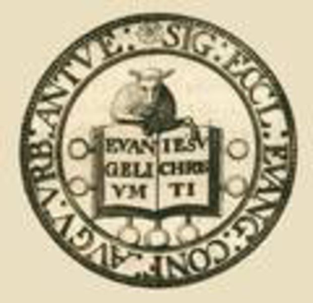 Siegel der NGACDas Siegel ihrer alten Gemeinde, dessen Stempel die Flüchtlinge von der Schelde an den Main mitgenommen hatten, wurde in Frankfurt von Anfang an als Erkennungszeichen des neuen Almosenkastens geführt. Es zeigt das in der Offenbarung des Johannes, Kapitel 5, geschilderte Lamm, das ein Buch mit sieben Siegeln hält. Die Umschrift lautet in deutscher Übersetzung: „Siegel der evangelischen Kirche Augsburger Confession in der Stadt Antwerpen". Die frühneuzeitliche Kirchenpolitik Frankfurts verwehrte es den niederländischen bzw. belgischen Flüchtlingen, eine rechtlich eigenständige Kirchengemeinde weiterzuführen, obwohl ihnen anderseits unter der Aufsicht des Rates über fast 200 Jahre ein besonderer Gottesdienst gewährt wurde. Beide Institutionen, Almosenkasten und Gottesdienst, gehörten zusammen. Rechtlich unabhängig waren die Niederländer aber lediglich in ihrer Armenpflege. So wurde der Almosenkasten zum Kristallisationspunkt der niederländischen Tradition.